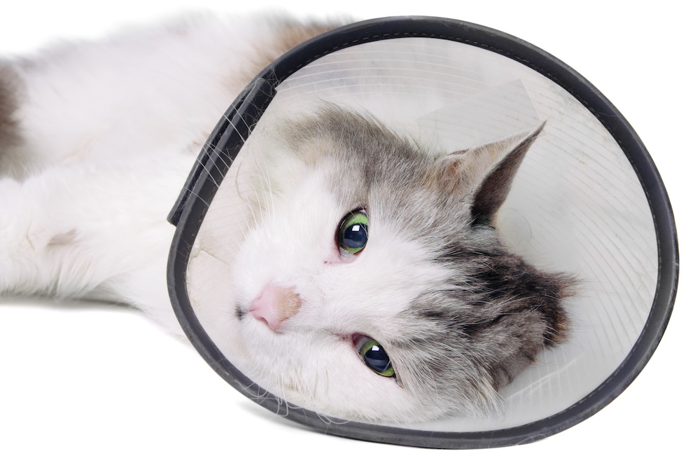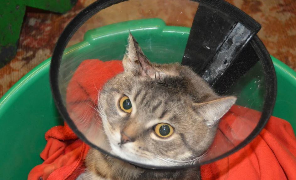 Чтобы кот не повредил ранку, был придуман защитный воротник.