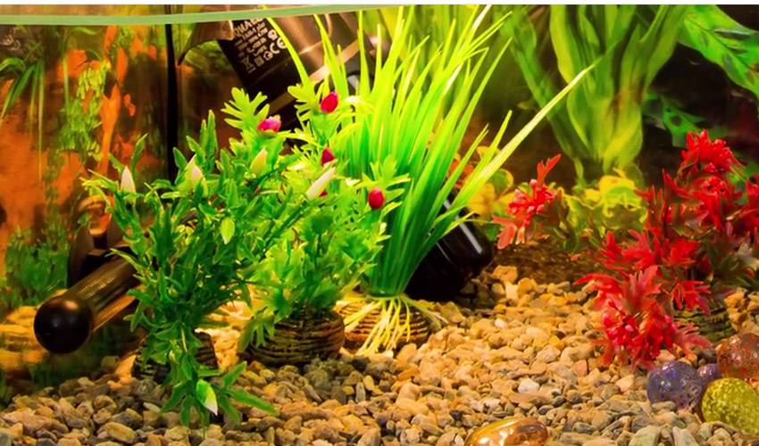 Оформить аквариум помогут и пластиковые растения. Они крепятся к грунту посредством грузов. Можно также установить на участках суши искусственные лианы из шёлка. Украсить домик для питомца помогут: