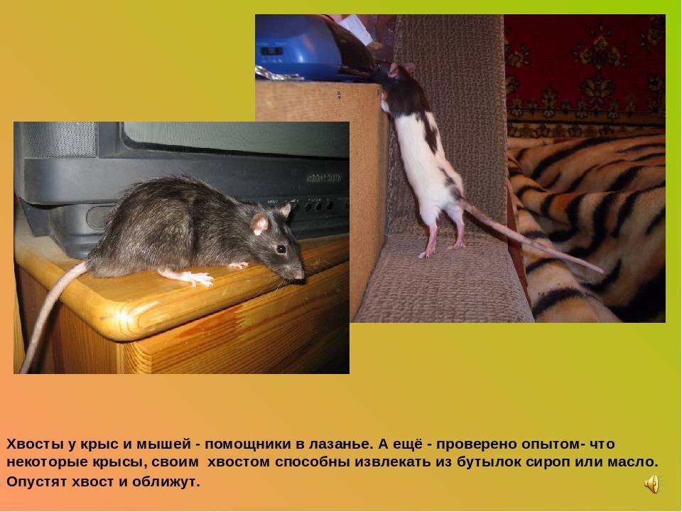 Хвост крысы. Хвост крысы длинный и лысый, но зачем? Во-первых, хвост служит балансирующим органом, помогающим крысе сохранять равновесие. Во-вторых, хвост крысы является еще одним органом чувств: крыса использует свои вибриссы (волоски на кончике хвоста), чтобы ориентироваться в пространстве и распознавать окружающие предметы.