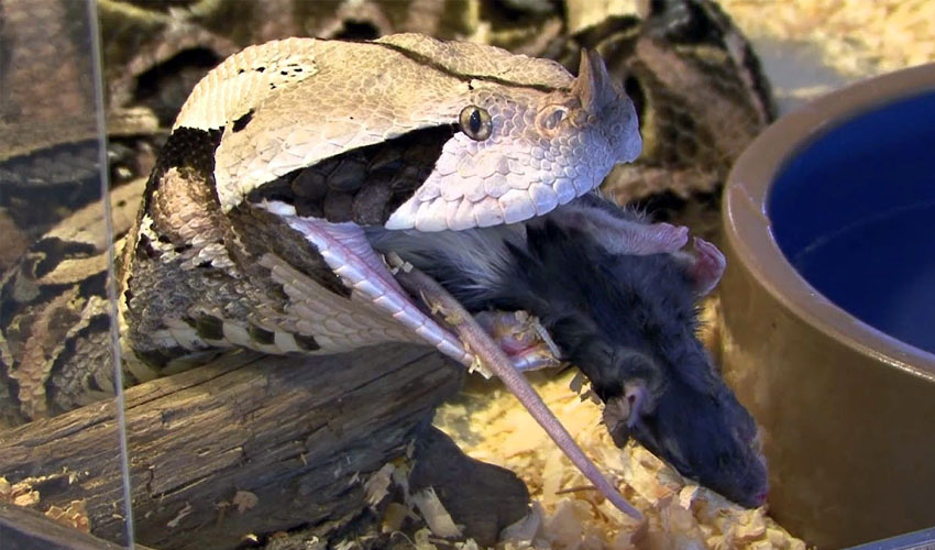 Но исследователям фауны известны и факты, когда добычей этих змей становились древесные обезьяны, дикобразы и даже карликовые антилопы. Атакует габонская гадюка со скоростью молнии, может напасть с любого угла относительно расположения жертвы, а после удерживать ее зубами.