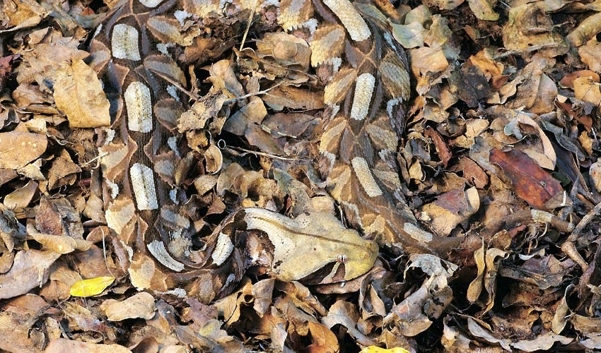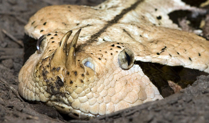 Этот вид гадюк имеет особое украшение на морде в виде вертикально торчащих чешуек. Толстое туловище этой змеи может достигать до 1,2 м в длину, к тому же оно покрыто очень красивыми узорами. Обитает во влажных лесах экваториальной Африки.